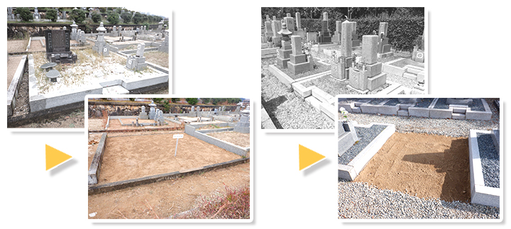 お墓じまいでは、① 霊園の管理者に墓所の使用権を返還、② 遺骨を新しい場所に移し、③ 遺骨を移した後のお墓を更地にすることになります。